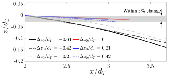 First, the bulk effect induced by these steps on the mean wake is illustrated in Figure 3. It reveals a distinct modulation of the magnitude () and type (forward vs. backward) of the step. In particular, a larger velocity deficit in the wake with the turbine right upwind of backward-facing steps occurred compared to the base case (flat terrain). The delay in the flow recovery exhibits qualitatively similar features noted in axisymmetric setups with adverse pressure gradients [48,49]. Conversely, the forward-facing steps induced reduced velocity deficit. This effect impacted the mean power, as discussed below. Here, the undisturbed flow is recovered more quickly, as evidenced by the entrainment of the outer flow levels. A notorious, distinct effect induced by the steps is the deflection of the wake. The center of the wakes shown with the dash-dotted lines evidence deflections negligible for the forward-facing steps and the base case, with deviations , as indicated in Figure 4. However, this is not the case for the backward-facing step; a noticeable deflection of around occurred in the near field at .