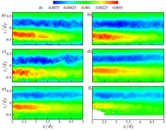 The different velocity deficits and the wake’s deflection triggered distinct changes in the turbulence and its statistics. Figure 5 and Figure 6 illustrate the distributions of the turbulence intensity, , and kinematic Reynolds stress, , where is the standard deviation of the streamwise velocity fluctuations and denotes a fluctuating quantity. Consistent with the mean velocity distribution and associated vertical gradients, these quantities are larger for the backward-facing steps. The forward-facing steps showed reduced levels compared to the base case. The deflection of is not evident, except for the enhanced interaction of the higher turbulence levels at the bottom tip with the shear layer turbulence induced by the step (Figure 5a). Deflection and magnitude changes are, however, further highlighted in the kinematic shear stress distributions. Figure 6 allows us to identify how the recirculation bubble indirectly affected the high-order statistics in the wake. In particular, the shear layer induced by the turbine top tip in the largest backward-facing step () exhibits a slight downward deflection up to . This distance reduced as the topographic step-change become less distinctive. The impact of turbulent transport is illustrated later.