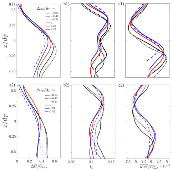 A closer look at the step effects on the wake statistics is evidenced with selected vertical profiles of , , and in the near and intermediate wakes. Figure 7a1 profiles taken at the very near wake at highlights the wake recovery rate difference between various topographies. A comparison with those in the intermediate field (Figure 7a2) shows a persistent delay with the backward-facing steps that imposed a favorable pressure gradient. Figure 7b1–c2 also highlights the changes in the magnitude, distribution, and vertical shift of the second-order statistics. Interestingly, the strongest did not coincide with the largest step in the near wake (). This phenomenon may be related to the shorter but more intense recirculation zone at the near wake for smaller steps.