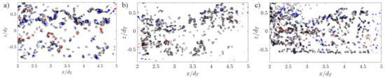 Instantaneous swirling strength distributions in the center plane () for equal to: (a) −0.64 step; (b) 0 step; and (c) 0.42 step.