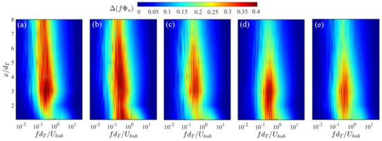 Compensated streamwise velocity spectral difference between various topographic steps and the flat terrain, , along the rotor axis for i equal to: (a) −0.64 step; (b) −0.42 step; (c) −0.21 step; (d) 0.21 step; and (e) 0.42 step.