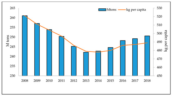 Municipal Solid Waste (MSW) produced in EU-28 in 2008–2018, in million tons and kg per capita [1].