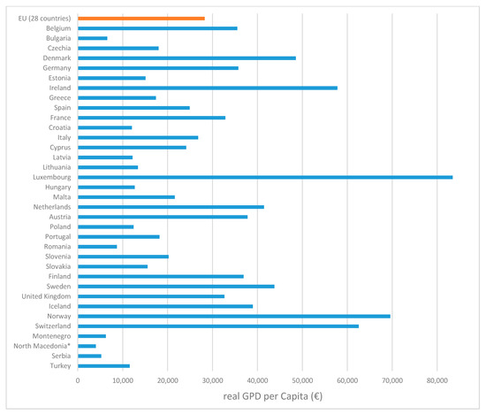 Economic development (measured as the gross domestic product (GDP) per capita, in EUR) of EU-28 member states in 2018 [14] (* 2018 value was not available for North Macedonia; therefore, the 2017 value is shown).