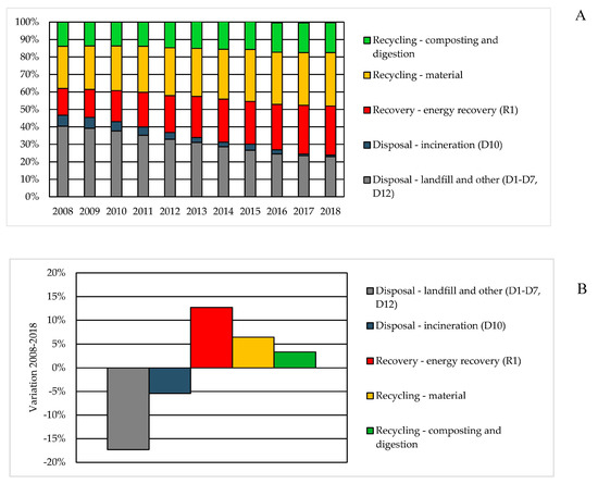 MSW management in EU-28 in 2008–2018: (A) historical evolution of waste management operations [1]; (B) net % variation of waste management operations between 2018 and 2008.