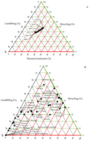 How is Europe dealing with this enormous amount of waste? The analysis of the average quotas for each MSW management strategy [1], studying their changes through the considered decade (Figure 3A), demonstrated a remarkable result of the policies adopted by the EU after the implementation of the WFD. A comparison between 2008 and 2018 (Figure 3B) showed a 17% reduction of the landfilled quota, counteracted by an increase of recycling (9%) and thermal treatments (13%). The same data can be tracked in a triangular diagram (Figure 4A), which makes evident that the member states exhibited a huge variability in MSW management operations (Figure 4B). Some countries are represented near one vertex of the ternary diagram (100% landfilling); other countries are found on the directly opposite side (70–80% thermal treatments and 40–70% recycling). Most northern and central countries (Austria, Belgium, Denmark, Finland, Germany, the Netherlands, Norway and Switzerland) apply policies to drastically minimize the landfilling of untreated MSW. Oppositely, countries still highly dependent on landfilling, over 70%, can be found (former Yugoslavia countries, Malta, Aegean countries, Romania). In between, the remaining countries are generally positioned in the region below 60% thermal treatments share. As a general statement, MSW management strategies are strongly related to economic development [20]; member states having a higher GDP, such as Germany and Sweden, prefer strategies based on recycling and WtE, whereas countries with a lower GDP mostly rely on landfill disposal.