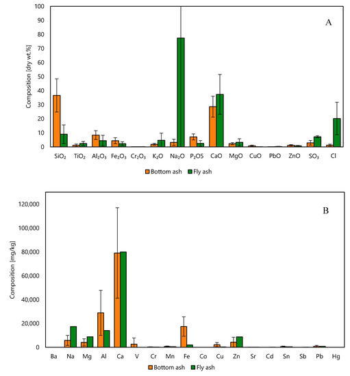 Composition of bottom and fly ash [45]: (A) minerals and (B) metals.