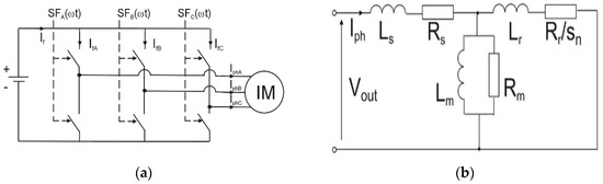 Analytical schema of the considered 3 phase 2-level inverter with load (IM—Model of an induction motor) (a) inverter schema (b) equivalent circuit of one phase of induction motor (sn—Slip for n-th harmonic).