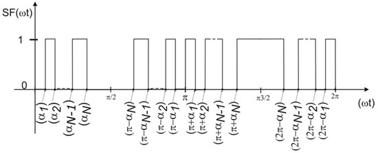 Waveform of switching function SF with quarter-wave symmetry and N switching angles.