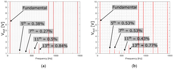 Simulated output voltage spectrum for SHE-SPWM carried out using Grasshopper Optimization Algorithm (GOA) for different tolerance: (a) tolerance < 1 × 10−4; M1 = 1.0; x = (0.1234; 0.4242; 0.5199; 1.2197; 1.2791); (b) tolerance < 1 × 10−10; M1 = 1.0; x = (0.1225; 0.4259; 0.5206; 1.2186; 1.2783)