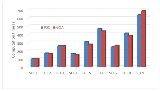 The best performance of GOA was recorded for settings: Np = 40 max_ite = 300, L = 1.5 and F = 0.5. For the aforementioned setting, GOA achieved 27% convergence (time of computation 101 s). The PSO achieved the best performance for: Np = 250, max_ite = 300, C1 = 1 and C2 = 0.5. Thus, GOA presents better performance than PSO regarding higher convergence for lower population size. Results presented in Figure 6 proves that for the SHE problem the GOA presents a significantly higher probability of convergence than the PSO algorithm. The most interesting result was achieved by using the GOA algorithm for population 40 and 300 iterations (the second-highest for this algorithm) where the probability of convergence was 28%. This result proves that the GOA algorithm can be very efficient for low population set up which reduces its computational effort. The highest recorded probability of convergence of PSO during the experiment was 15% (time of computation 260 s). The GOA algorithm gives a better result faster. The computation effort is extremely significant during the application of the optimization task for the task. In this paper, coefficients of the compared algorithm were selected in such a way to keep comparable computation time. The parameters which are affecting computation time are population size Np and the maximum number of iteration max_ite. Results presented in Figure 6 can be divided into 9 SETS regarding Np and max_ite. Table 2 presents computation time for the PSO and GOA performed on a computer with processor Intel Core i7-8557U. Results from Table 2 are presented in Figure 7. The parameters Np and max_ite were selected to keep similar computation time for GOA and PSO for one SET. The GOA in every iteration calculates the position of every agent (grasshopper) related to every agent in the swarm, PSO calculates the only position of the agent related to the position of the pest particle. That is why GOA needs higher computational effort than PSO for the same Np. Thus, to make it comparable the Np for GOA was reduced in every SET.