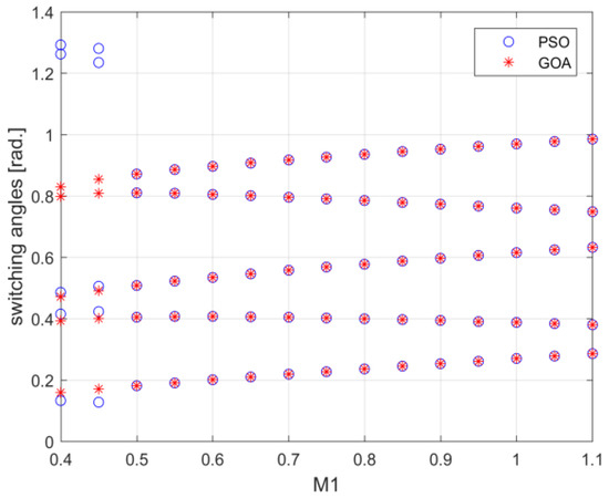 Figure 8 shows the switching angles calculated by PSO and not modified GOA as the function of modulation index M1.