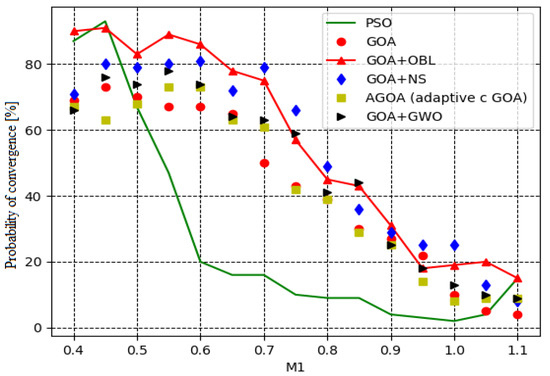 In this subsection, the convergence of GOA with modifications and PSO algorithms has been carried out. Assumptions from section V A and Table 3 are valid in this section. However, the comparison has been conducted for a wider range of modulation index M1 = 0.4 ÷ 1.1.