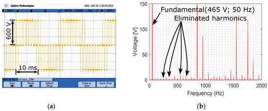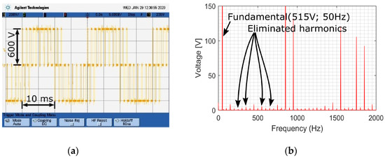 Experimental results for inverter’s phase to phase output voltage for M1 = 0.9 (a) waveform oscillogram (b) spectrum.