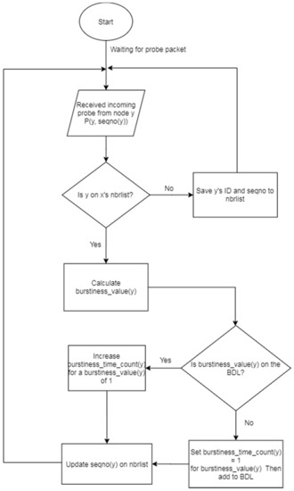 First, the neighbor list (nbrlist) and the BDL are set to empty. When sensor node x receives a probe packet from node y, it saves node y’s ID and sequence to its nbrlist if node y is not already on node x’s nbrlist. If node y is on node x’s nbrlist, node x will calculate the burstiness value for node y as follows: