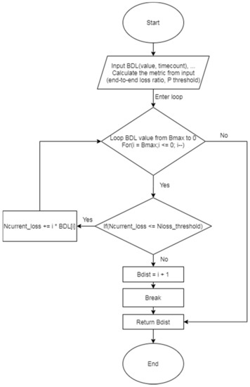 The Bdist metric is set equal to the burstiness value, such that the total of Ncurrent_loss lower than, or equal to, the Nloss_threshold. The detailed calculation of Bdist is in Algorithm 2 and the flowchart for Algorithm 2 is in Figure 4.