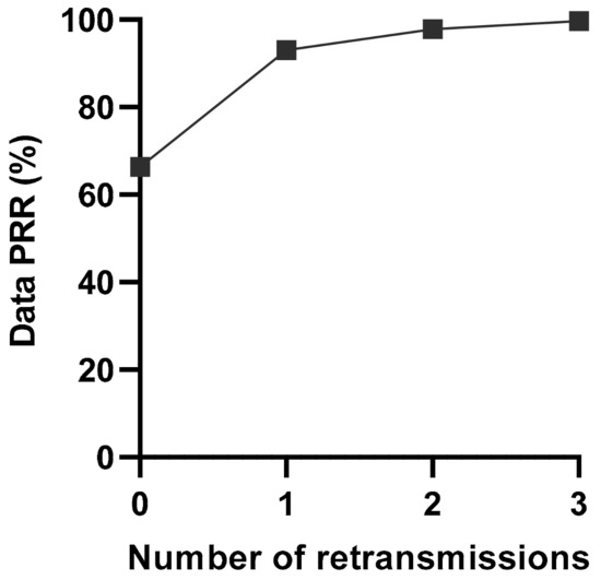 To evaluate the effect of the number of retransmissions on the performance of the network, a simple network with one sink (gateway) and nine sensor nodes was considered. The link quality of the channel was fixed, while the number of retransmissions varied from 0 to 3, and we examined the packet reception rate at the sink with each value for the number of retransmissions.