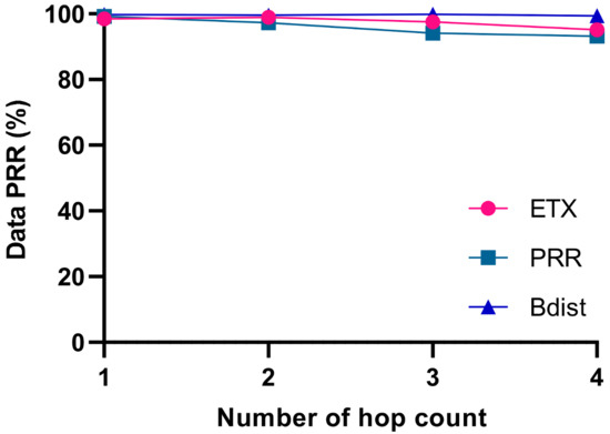 The results are presented in Figure 6, where it is indicated that our proposed method achieved a very high PRR, even at the highest hop count. That is because our proposed method provided a good estimation of the number of transmissions by using the target PRR to estimate link quality. Under other schemes, the PRR decreased since the hop count increased. This is because with the two other schemes, the estimate of the number of transmissions was not very good.