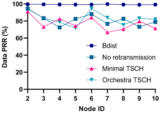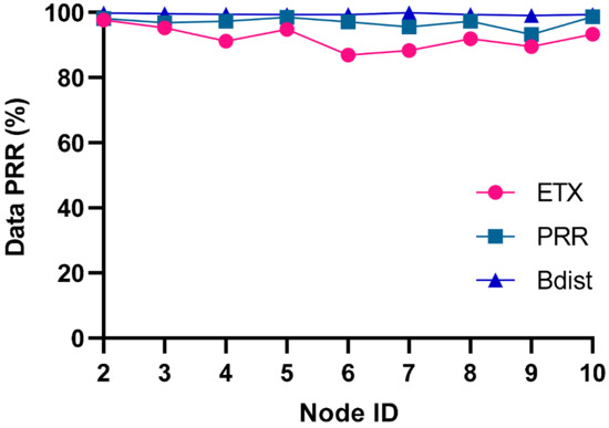 Figure 8 shows the data PRR of each sensor node at the sink. From Figure 8, the network performance of the proposed Bdist metric had the highest reliability compared with the other network schemes. Almost all sensor nodes achieved the target PRR by using the number of transmissions calculated with our method. Other network schemes showed lower performance since they did not consider the retransmissions.