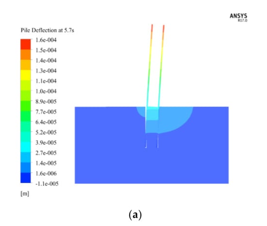 The displacement of soil under extreme wave and current conditions is further analyzed as depicted in Figure 8. It is found from Figure 8a for the loading time of 5.7 s that, when the deflection of the pile head reaches the maximum positive direction, the upper part of the soil within the pile will produce positive displacement, and the lower part will produce reverse displacement. A similar conclusion can be obtained from Figure 8b that, the movement of the upper part of the soil within the pile is in the same direction as the pile head. In addition, the displacement of the soil around the pile should also be paid attention to, for the calculated results show that the displacement of the soil around the pile at the mud surface is significantly greater than that of the soil at the pile end which is less affected by the environmental conditions.
