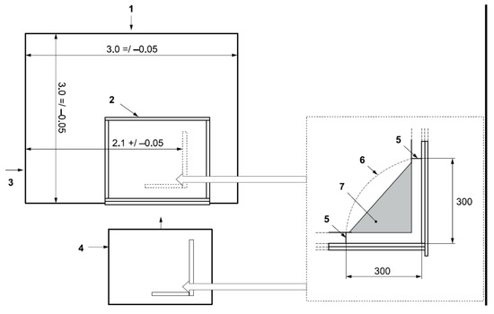 The front wall of the test room had an opening (1.38 m (width) × 2.13 m (height)) to insert the trolley into the test room. Windows were placed in the two walls facing the front side of the two perpendicular specimen planes. With the trolley in place in the test room, the distance between the long wing specimen surface touching the U-profile and the wall of the test room was equal to 2.10 m [27].