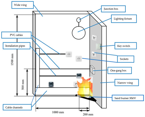 - Specimen 1—wall made of combustible material (wood particleboard (oriented strand board, OSB) 15 mm in thickness) with mounted circuit electrical installation (Figure 2, Table 1).