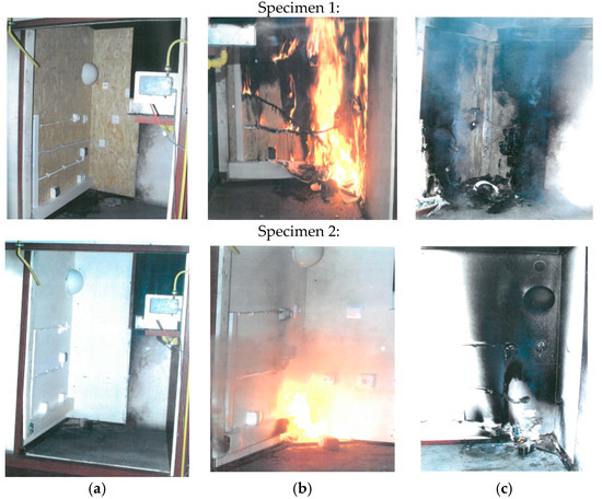 View of specimens at SBI test apparatus—electrical installation on the combustible substrate (specimen 1) and non-combustible substrate, e.g., calcium-silicate board (specimen 2): (a) before the test, (b) during the test, (c) after the test.