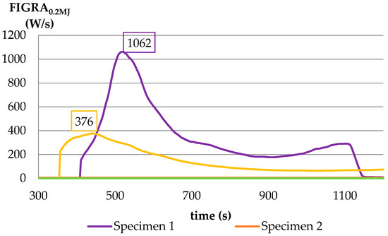 The maximum value of the FIGRA parameter (equal to 1060 W/s) was obtained in 516 s of test duration for the electrical installation mounted on the combustible substrate (specimen 1 in Figure 3), while for the substrate itself a three times lower value was obtained (specimen 2 in Figure 3). It clearly shows the significant role of the electrical installation in the development of fire on the combustible wall (e.g., wood-based material). Such behavior was not observed in the case of specimen 2 (non-combustible substrate). Due to a lack of fire spread over the surface of the non-combustible substrate, the electrical installation was not involved in the combustion process; therefore, a very limited heat release similar to the substrate itself was measured (specimen 2 and 4 in Figure 3).