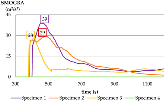 SMOGRA values (Figure 5) differed significantly for both specimens with the non-combustible substrate (No. 2 and 4), while in the cases of specimens with combustible substrates (No. 1 and 3), the SMOGRA values were lower for the reference specimen and equal to 28 cm2/s2. For specimen 1 the maximum value of SMOGRA equal to 39 cm2/s2 was obtained at 453 s of the test duration.