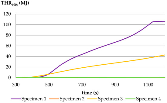 THR600s results (Figure 6) were similar for specimens 2 and 4 and were relatively low (0.1–0.5 MJ). The largest THR600s parameter was obtained for specimen 1 (THR600s equal to 66.8 MJ). It was much higher than the limit value for reaction to fire class C, which should not exceed 15 MJ, e.g., more than four times less.