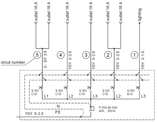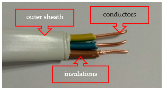 The electrical installation consisting of five electrical circuits (Figure 10) typical for a residential building connected to the mains was experimentally studied on two types of substrates of opposite combustible properties. This electrical installation was permanently fixed to the substrate as a component of specimen 1 (on the combustible substrate) and specimen 2 (on the non-combustible substrate). The cable (Figure 7) consisted of three copper conductors with a cross-sectional area of 1.5 mm2.
