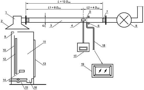 Schematic of test equipment in accordance with the EN 50,399 standard [28]; 1—chamber, 2—hood, 3—exhaust duct, 4—bidirectional probe, 5—sampling probe, 6—smoke measuring equipment, 7—guide vanes, 8—extracting ventilator, 9—smoke outlet, 10—ladder, 11—test chamber, 12—cables testes, 13—door, 14—burner, 15—air inlet duct, 16—air inlet box, 17—pressure transducer, 18—gas sampling line, 19—O2 and CO2 analyzers.