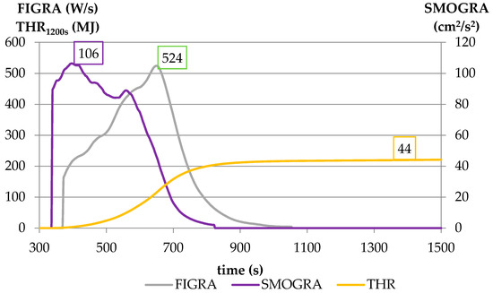 FIGRA0.2MJ and FIGRA0.4MJ (W/s) are maxima of the quotients of heat release rate from the specimen and the time of its occurrence using THR-thresholds of MJ relatively, where THR600s (MJ) is total heat release from the specimen in the first 600 s of exposure to the main (primary) burner flames, TSP600s (m2) is total smoke production from the specimen in the first 600 s of exposure to the main (primary) burner flames and LFS (m) is lateral flame spread (maximum range) on a wider specimen wing [27].
