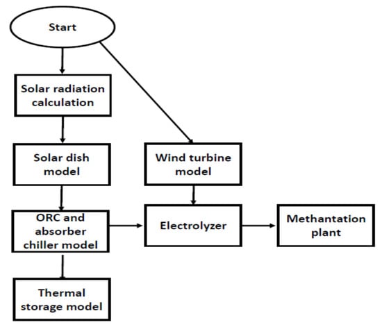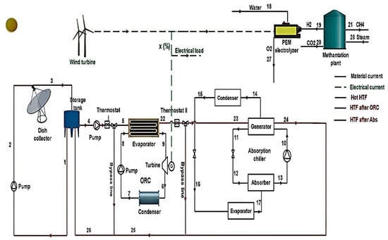Figure 1 is a schematic diagram of the proposed system, the arrows also illustrating the process. The proposed system comprises six subsystems: solar dish, ORC, single-effect absorption chiller, proton-exchange membrane (PEM) electrolyzer, wind turbine, and methanation plant. The working fluids in the solar dish, ORC, and absorption chiller subsystems are Terminol VP-1, R134a, and lithium bromide solution, respectively. Terminol VP-1 is capable of operating under pressures of 15 bar and temperatures up to 400 []. R134a exhibits the highest energy and exergy efficiencies for the ORC system [,,]. Water, as a refrigerant and lithium bromide as an absorbent, is one of the most used working fluid pairs in the absorption chillers [].
