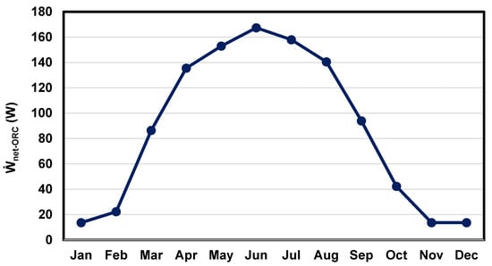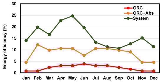 Bellos and Tzivanidis [] reported examination of an ORC based hybrid system with an ejector device, with 87% and 12% energy and exergy efficiencies, respectively. Gogoi and Saikia [] studied a combined system having a solar-based ORC cycle and an absorption cooling system, considering five different working fluids for the environmental conditions of Jaipur, India. They concluded that the system provided a net power up to 1.7 MW in February with R245fa as the working fluid, and a maximum cooling of 6.0 MW was obtained with Neopentane.