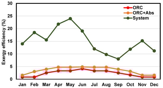 Calise et al. [] reported the performance of a hybrid system based on solar energy, geothermal energy, and an auxiliary boiler, for the combined production of cooling, heating, power, and freshwater purposes. The results of this study demonstrated the maximum exergy efficiencies of about 50% and 20%, when operating in the heating and cooling mode, respectively.