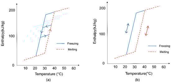 Some researchers try to model the transition between freezing and melting processes within the phase change range. There are mainly two approaches currently. Bony et al. [39] proposed one approach in which the enthalpy transition line between the melting and freezing processes is a straight line that parallels to the sensible enthalpy curve, as shown in Figure 1a. Another approach is used in the models of Kaushik et al. [40]. It suggests that there is no hysteresis shown until the PCM completely solidifies or melts. Then the enthalpy curve changes to another one, as seen in Figure 1b. Ramprasad et al. [23] compared the two approaches with EnergyPlus simulations, and found out that hysteresis does not have a large influence on the annual building energy use, but the influence on the surface temperature and zone temperature is considerable.