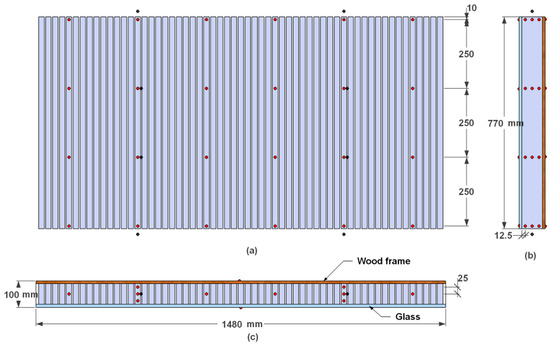 Locations of the sensors for the monitoring of the PCM air temperatures in the heat exchanger for experimental and simulation cases [31]: (a) front view; (b) side view; (c) top view.