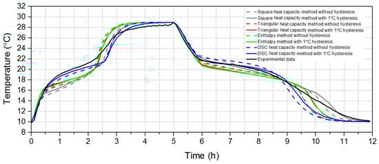 Figure 3 shows the average PCM temperature profiles at a height of 510 mm in the heat exchanger predicted by different PCM models and measured during the experiments. The temperature profiles of all the models show trends that are similar to the experimental data. The curve of the DSC heat capacity method with a 1 °C temperature hysteresis has the best fit to the experiment, especially during the phase transition periods (0.7–2.4 h and 6.7–10 h).
