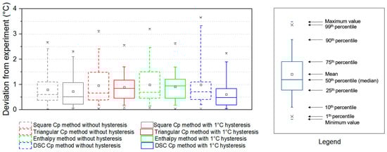 Figure 4 shows the temperature deviation between model results and experimental data. The minimum model deviation comes from the DSC heat capacity method with a 1 °C temperature hysteresis. All the models show acceptable accuracy. The model deviations are always less than 1 °C. The model with the DSC heat capacity method and 1 °C temperature hysteresis has the lowest deviation from the experiment, with 0.6 °C of average deviation and 2.2 °C of maximum deviation.