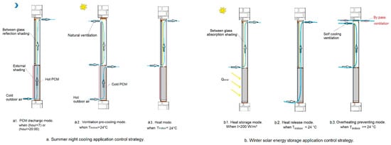 The PCM-enhanced ventilated windows (PCMVW) control strategies for both summer and winter applications [45].