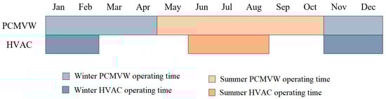 This study is conducted for the Danish climate. The summer application operated from 1st May to 31st October, while the winter application operated from 1st November to 30th April. The heating, ventilation and air conditioning (HVAC) system only operated during severe summer and severe winter periods, in cases when the PCM thermal energy storage could not provide enough pre-heated or pre-cooled air. The HVAC system is a packaged terminal heat pump system with a heating coil COP of 2.87 and cooling coil COP of 1.87. The room air temperature setpoint is 22–26 °C. The period of severe summer is from 1st June to 31st August. The period for severe winter is from 1st November to 29th February. The transition season is when there is no operating HVAC system. The summer transition season is May, September and October, and the winter transition season is March and April. The corresponding PCMVW and HVAC operation schedules can be found in Figure 6.