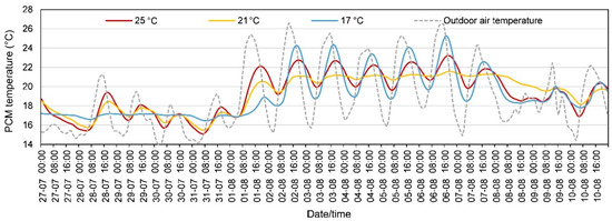 For summer night cooling applications during the severe summer conditions, 11 PCM with different phase transition temperatures (no hysteresis) are firstly studied. For those PCM, the melting temperature equals freezing temperature. Their latent heat, thermal conductivity and other properties are all the same. Figure 7 shows some of the PCM temperatures from those cases. There are large differences in the PCM temperature profiles for PCM with different phase transition temperatures. For the days with low average daily outdoor air temperature, the PCM with low phase transition temperature has a more stable temperature profile and a relatively low temperature during the daytime. For the days with high average daily outdoor air temperature, the PCM with high phase transition temperature has a more stable temperature profile and a relatively low temperature during the daytime. For PCM with a 21 °C phase transition temperature, the PCM temperature is more stable than the PCM with 25 °C for most days. That is because the average outdoor air temperature is much closer to 21 °C, so that the PCM with a 21 °C phase transition temperature is more activated than the one with a 25 °C phase transition temperature. The relations between the PCM phase change temperature and the PCM temperature profiles are quite different from day to day due to the differences in the daily outdoor air temperature.