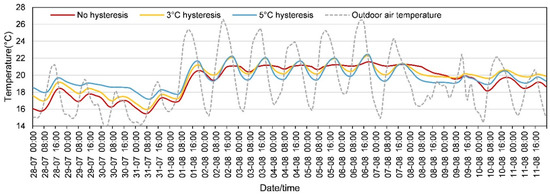 The study is carried out with seven PCM with different hysteresis degrees during severe summer. For those PCM, hysteresis degree is the difference between the melting peak and the freezing peak; melting peak = 21 °C + hysteresis/2; freezing peak = 21 °C − hysteresis/2. Figure 8 shows some of the PCM temperatures. It shows that PCM with no hysteresis has the most stable temperature profile and lowest temperature during the daytime for most of the days when the ventilation pre-cooling is needed, and the PCM with 5 °C hysteresis has the highest temperature during the daytime for most of the days when the ventilation pre-cooling is needed. When outdoor air temperature is relatively low, the PCM with no hysteresis has the lowest temperature during both daytime and nighttime. It indicates that PCM with no hysteresis can benefit the building’s energy-saving the most during severe summer.