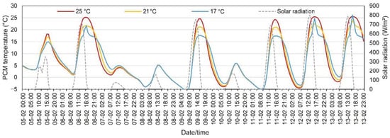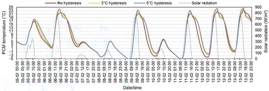 Subsequently, Figure 10 shows the influences of PCM hysteresis degree on the PCM temperature profiles for winter solar energy storage applications. It shows that for the days with high solar radiation, PCM with larger hysteresis has a higher temperature during most of the nighttime when the ventilation pre-heating is needed, for example, 5th and 6th of February. For the days with low solar radiation, no significant difference is found among the models with different hysteresis, as the case of 8th February shows.