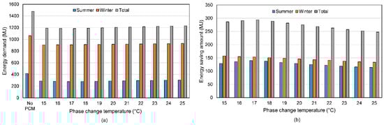 The influence of PCM phase change temperature on building energy for severe summer and winter seasons: (a) the heat pump’s energy demand; (b) the energy savings compared to no PCM.