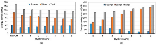 The influence of PCM hysteresis on the building’s energy for severe summer and winter seasons: (a) the heat pump’s energy demand; (b) the energy savings compared to no PCM.