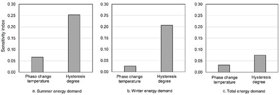 The sensitivity index of phase change temperature and hysteresis degree on the HVAC energy demand: (a) the summer energy demand; (b) the winter energy demand; (c) the yearly total energy demand.