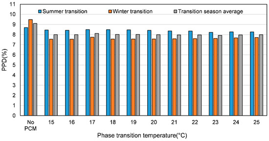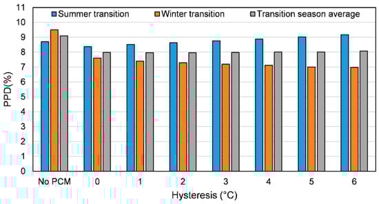 Similarly, the influence of the PCM hysteresis on the PPD is shown in Figure 15. Compared to the model without PCM, the models with PCM all have lower PPD. For the summer transition season, the PPD increases along with the increase of the PCM hysteresis. For the winter transition season, the PPD decreases along with the increase of the PCM hysteresis degree. Consequently, the average PPD during the transition season remains the same along with the increase of the PCM hysteresis degree.