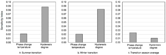 Another sensitivity analysis is conducted to study which parameter has a higher impact on indoor thermal comfort during transition seasons. The results are presented in Figure 16. It is shown that the hysteresis degree has a larger sensitivity index than the phase change temperature for both summer and winter transition seasons—0.088 and 0.082, respectively. However, the transition season average sensitivity indexes of both hysteresis degree and phase transition temperature are not so high, which indicates that the PCM has a large influence on the thermal comfort in summer transition and winter transition seasons, but not a large influence on the annually average thermal comfort during transition seasons. The phase change temperature does not have great influence on the thermal comfort in transition seasons.