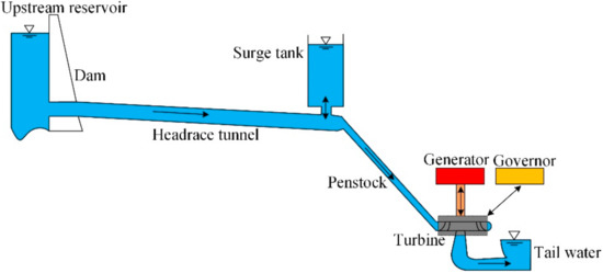 Between surge tanks and sloping ceiling tailrace tunnels, the former are the most widely used pressure reduction facilities found in hydropower stations [27,28]. A surge tank divides a hydropower station into two parts. The first part is the headrace tunnel. The second part is the penstock, turbine unit and regulation system. Surges tank should be set as close to the turbine unit as possible. Then the penstock flow inertia can be reduced and the turbine unit is protected. The body type, size and flow inertia of headrace tunnels determine the hydraulic parameters of surge tanks [29]. Because of the existence of surge tanks, the headrace tunnels and surge tanks form a connected subsystem. The headrace tunnels and turbine units are separated by the surge tanks and not connected directly. As a result, the influence of headrace tunnels on the turbine units is indirect. The setting of surge tanks has unfavorable effects on the safe and stable operation of hydropower stations. To be specific, the water flows back and forth in the subsystem of headrace tunnels and surge tanks, which brings about water level oscillations in surge tanks [30,31]. The water level oscillations in surge tank have non-minimum phase features. Moreover, the water level oscillation in surge tanks is a kind of mass wave and has a low frequency. For the turbine units, the water level oscillation in surge tanks represent a new external interference source. That external disturbance interacts with the frequency and power output of the turbine. Then the dynamic performance of the hydropower station is affected by the surge tank [32,33]. The complexity and requirements of dynamics of the turbine regulating system with surge tanks are higher than those of turbine regulating systems without surge tanks. The challenge for the control of turbine regulating system with surge tanks is huge [34].